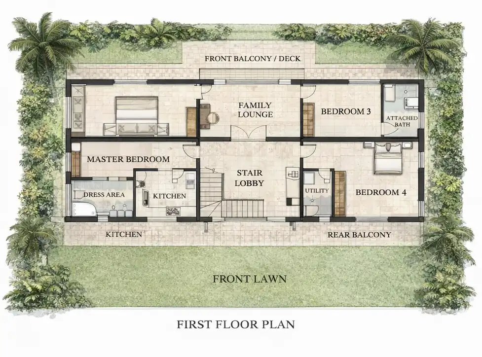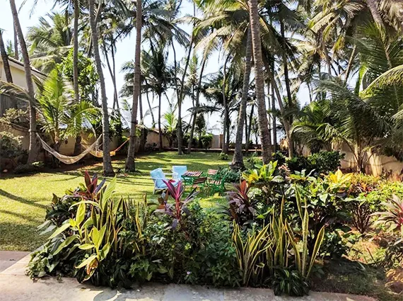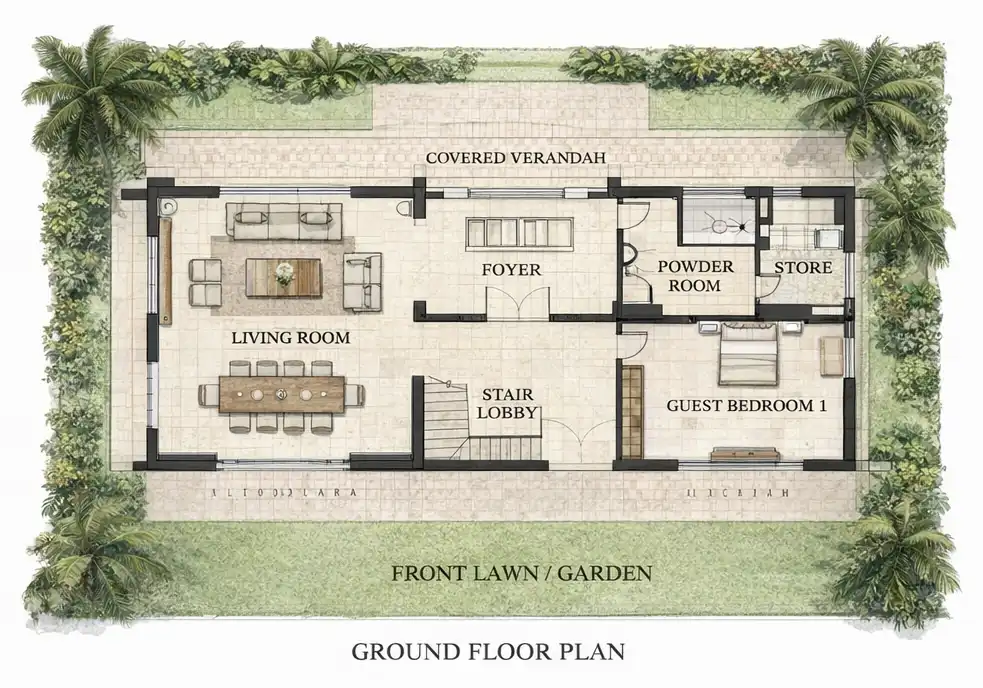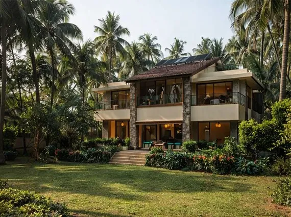 Spread across a generous 1,342.25 sq m (approx. 14,448 sq ft) plot, the property is framed by towering coconut palms, manicured lawns, and direct access to the sandy shoreline. The villa itself offers approximately 4,000 sq ft of carpet area, thoughtfully designed over two levels to maximise light, views, and indoor–outdoor living.