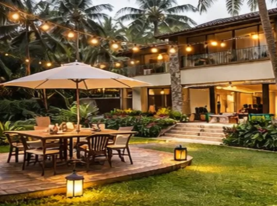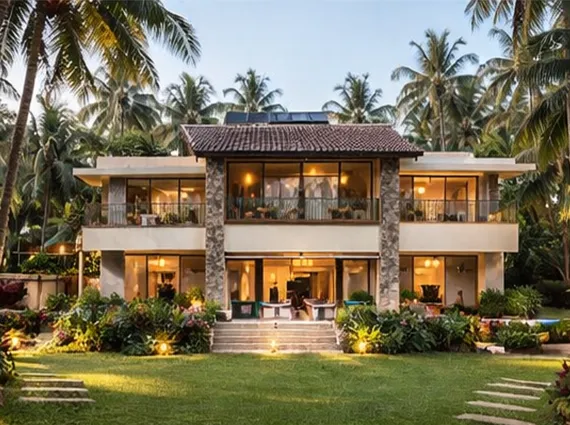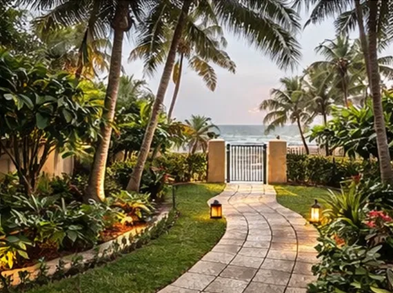 From the moment you arrive, a landscaped pathway leads you through lush tropical gardens to a warm, contemporary home that opens out to expansive green lawns and the Arabian Sea beyond. Large glass windows and wide balconies invite uninterrupted sea breezes and panoramic coastal views into almost every room. The interiors flow seamlessly into outdoor entertaining spaces—perfect for sunset dinners, garden gatherings, or relaxed evenings around a fire pit under the stars.