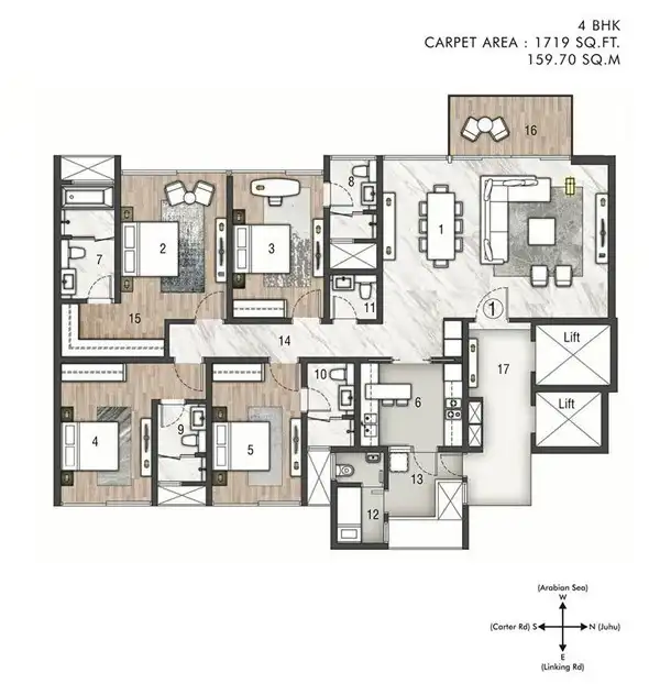 Located on the 16th floor of Wing E, this expansive 1,990 sq.ft. carpet area apartment is positioned to maximise cross ventilation, abundant natural light, and stunning sea views. The elevation ensures privacy, quietude, and a commanding outlook over the western skyline, while large-format windows bring the outdoors seamlessly into the living spaces.