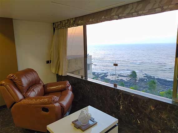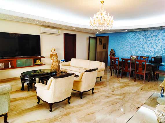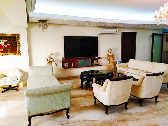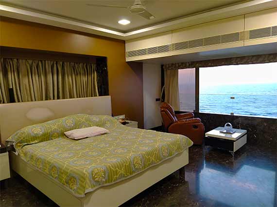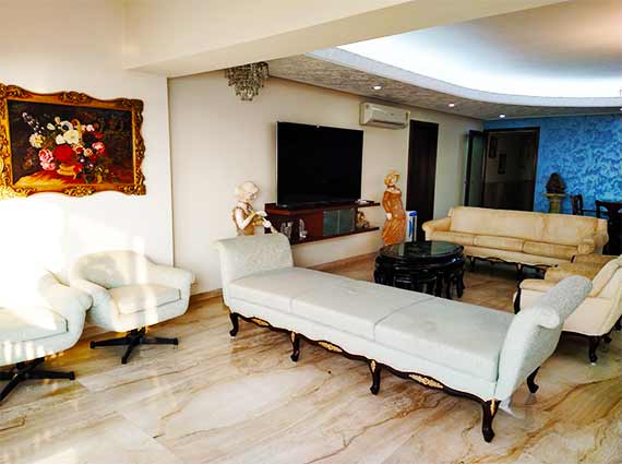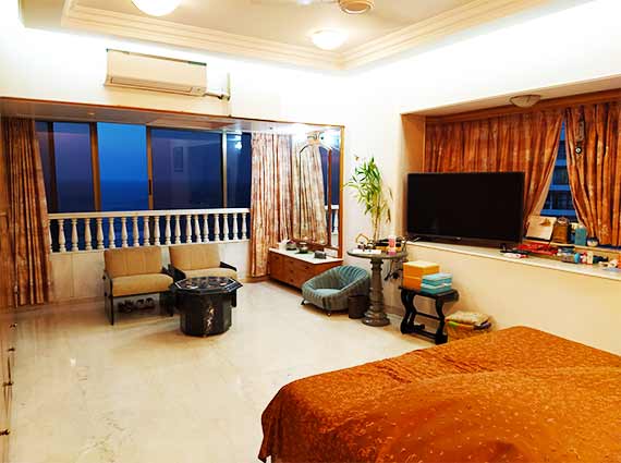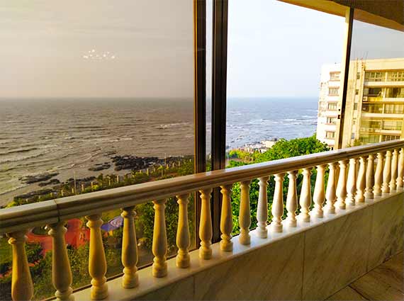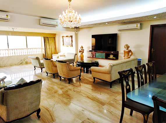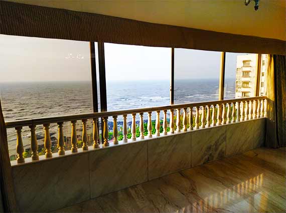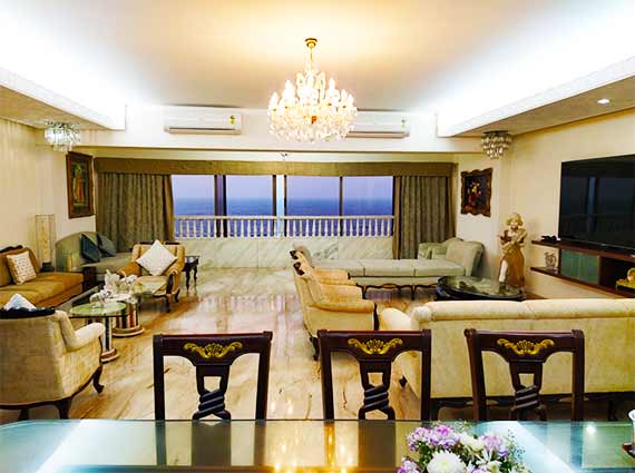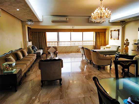 A furnished sea facing 5 BHK Jodi Apartment covering an entire floor is available for sale with us at Sudhakar Apartments Nepean Sea Road in South Mumbai. Sudhakar is a 50 year old edge-of-the-sea apartment building that has been recently renovated and transformed into a practically new apartment building consisting of spacious sunny and wind-soaked 3 BHK apartments. Though there are lots of great apartment units available at Nepean Sea Road, this apartment building is one of the few that offers unrivaled unobstructed views of the sea to all residents of this building. In front of the building lies a rectangular public garden beyond which lies the crashing waves of the sea.