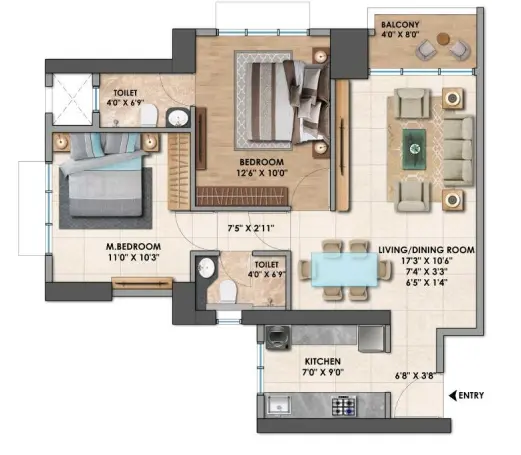 - 2 BHK residences range approximately from 667 sq.ft. to 683 sq.ft. carpet area, featuring compact yet practical layouts with defined living/dining zones, attached bedrooms, and balconies.
