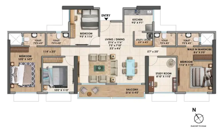 - 4 BHK apartments extend from about 1,327 sq.ft. up to 1,378 sq.ft. carpet area, offering expansive living-dining areas, multiple en-suite bedrooms, dedicated study rooms in select layouts, and generous balconies.
