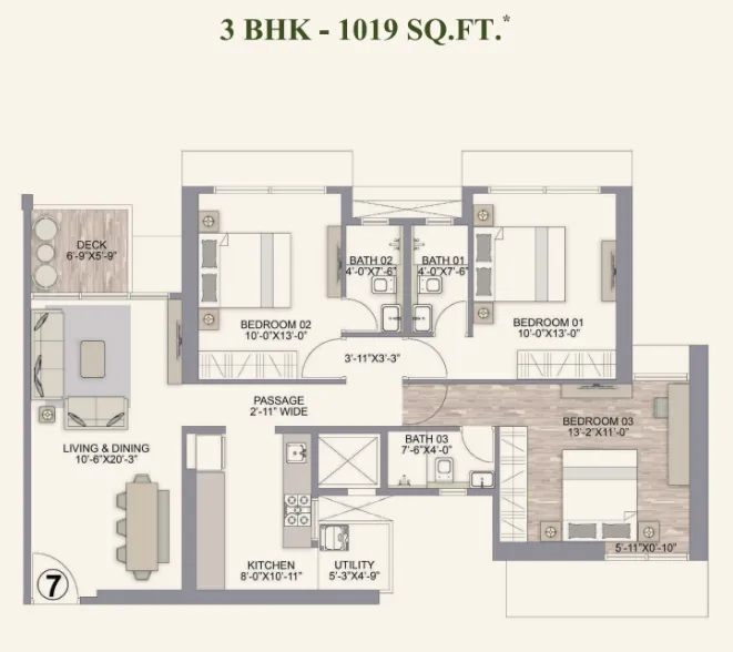 The 3 BHK apartments are designed as spacious family homes with expansive layouts. These residences include larger living rooms, multiple bedrooms, and well-planned dining areas that allow seamless interaction between different parts of the home.
