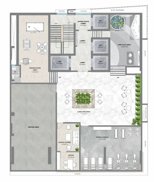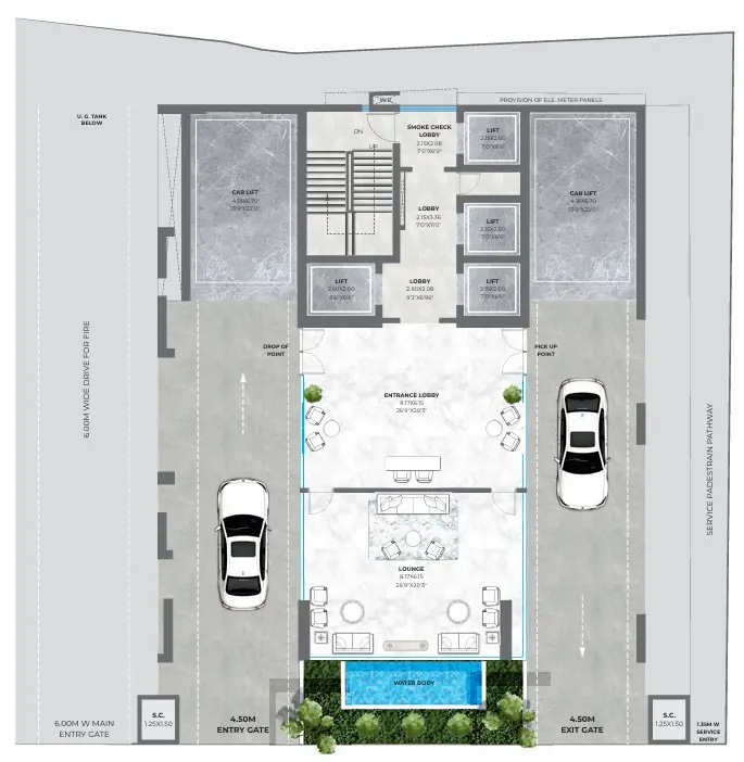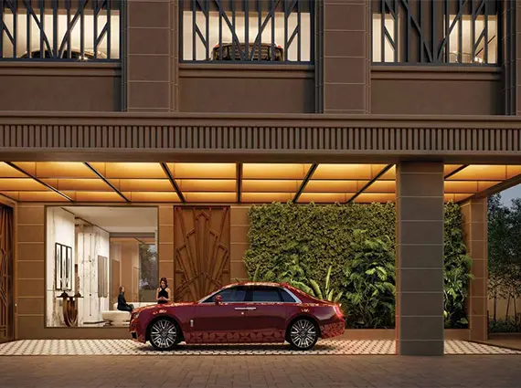Adding to the luxury, a dedicated full-floor parking podium becomes your private automotive gallery, naturally ventilated and spacious enough for five long-wheelbase cars, with nearly 1,000 sq. ft. left to personalize – whether as a showcase for your collection or a bespoke workshop.