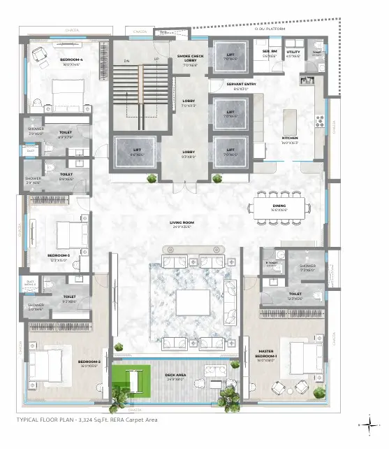 Each residence at Crescent 9 is an expansive 3,324 sq. ft. of RERA carpet area, with peripheral columns and hybrid decks that give you freedom of space like never before. The sheer versatility allows you to envision your home as either: