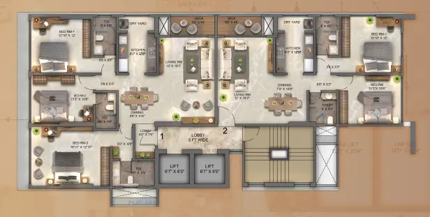 The 3 BHK residences are engineered for functional family living. Each home features a balanced spatial flow between living, dining, and private bedroom zones. The layouts prioritize: