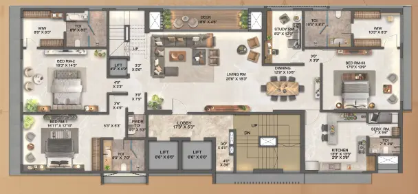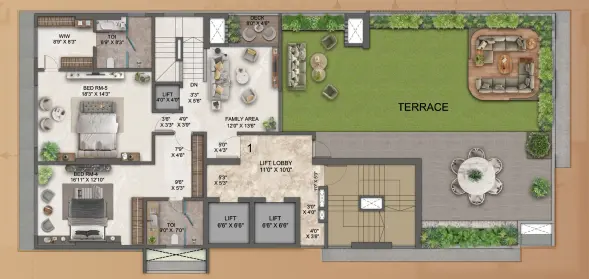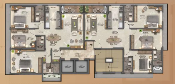 Designed across multiple levels, the penthouse incorporates generous living spaces, private family zones, and a dedicated terrace area—creating a villa-like experience in the sky. The layout allows for:
