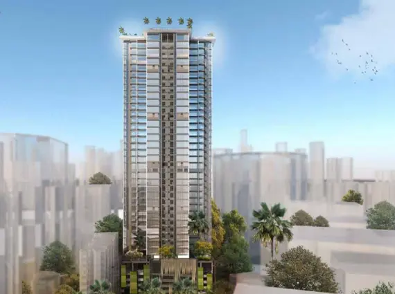 The tower rises with a contemporary vertical expression, marked by clean lines, layered façade elements, and generous glazing that allows abundant natural light into residences. The elevation avoids visual clutter, presenting a modern yet timeless profile that integrates seamlessly into the premium streetscape of Khar West.