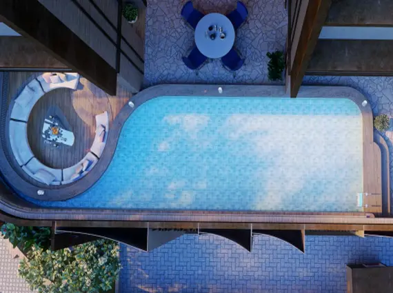 - Swimming pool and deck seating areas