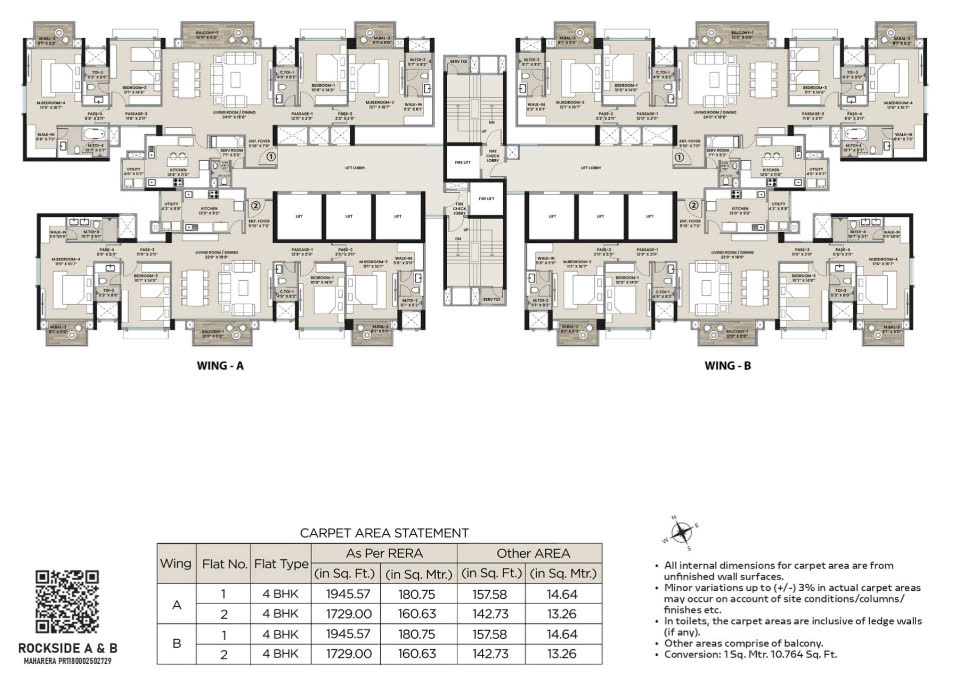 The 4 BHK residences at Hiranandani Rockside feature large living and dining areas, spacious bedrooms, and thoughtfully designed layouts. Carpet areas range from approximately 1871 sq. ft. to 2103 sq. ft., offering generous living space for families.