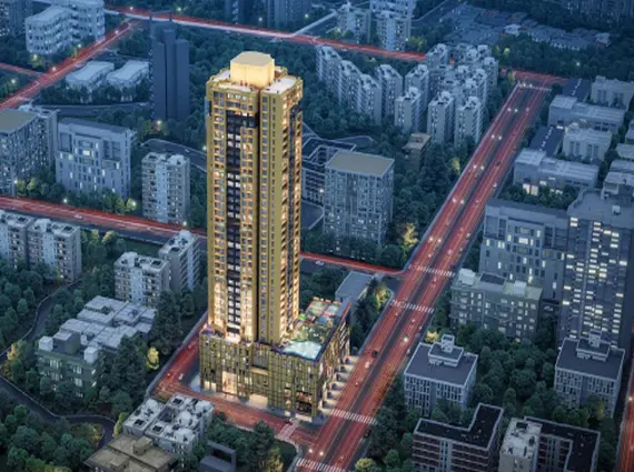 The development stands as a 37-storey residential tower offering spacious 2 BHK and 3 BHK residences along with modern amenities and podium-level lifestyle spaces.