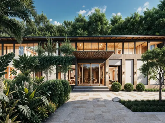 The design prioritizes balance—between openness and privacy, scale and intimacy, structure and nature. Large windows frame views of greenery and distant hills, while semi-covered corridors, decks, and shaded outdoor spaces soften transitions between indoor and outdoor living.