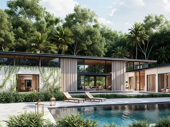 Outdoor amenities include a private swimming pool, open decks, and curated garden spaces that support both recreation and quiet retreat. The estate format allows owners the flexibility to further personalize outdoor areas—whether for wellness, leisure, or entertaining—within an approved, low-density environment.