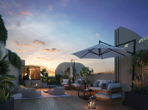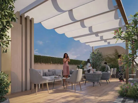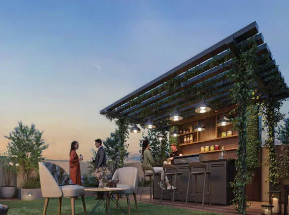 Blissful rooftop amenities with lush terrace garden views.