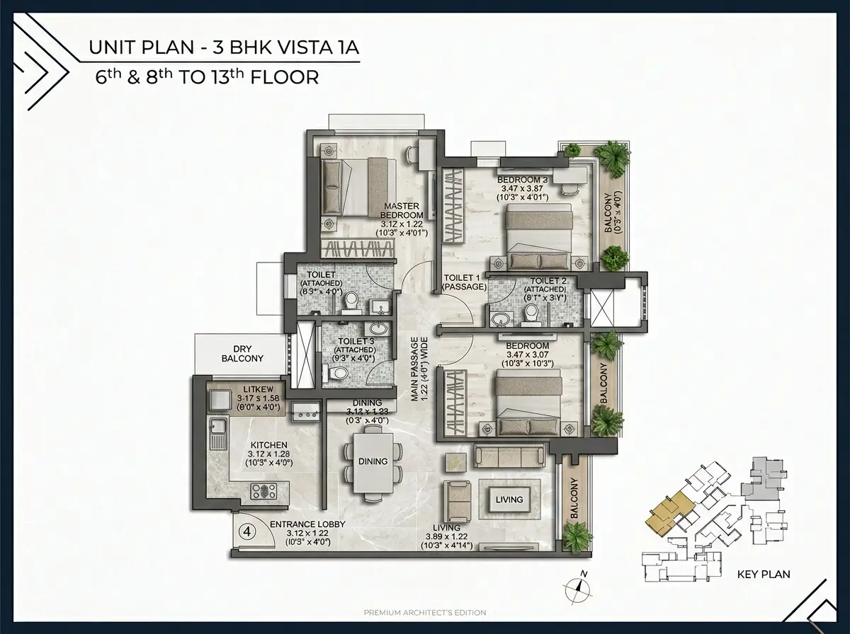 - 3 BHK homes ranging from approximately 1000 to 1075 sq.ft carpet