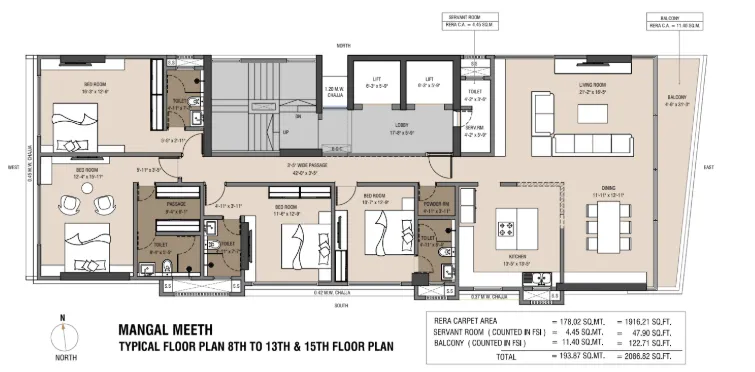 Mangal Meeth offers exclusively 4 BHK luxury residences, each spanning approximately 2,086 sq. ft. of RERA carpet area. With a single apartment per floor, every home commands a sense of exclusivity that few Mumbai properties can offer.