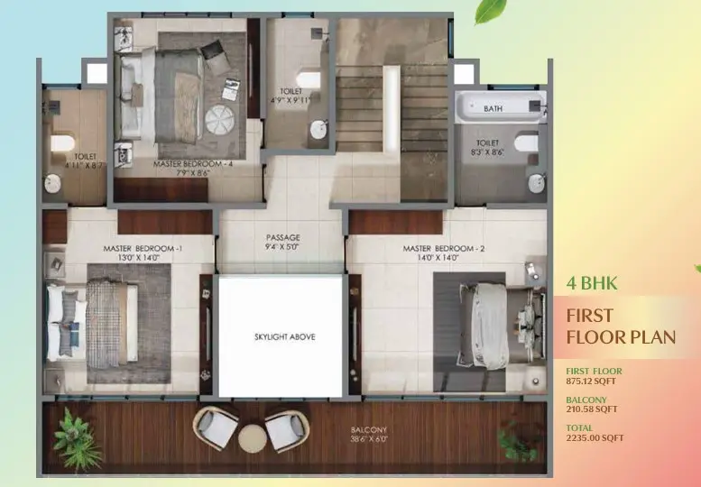 • First Floor: Three additional bedrooms with en-suite baths, walk-in wardrobes, and private balconies.
