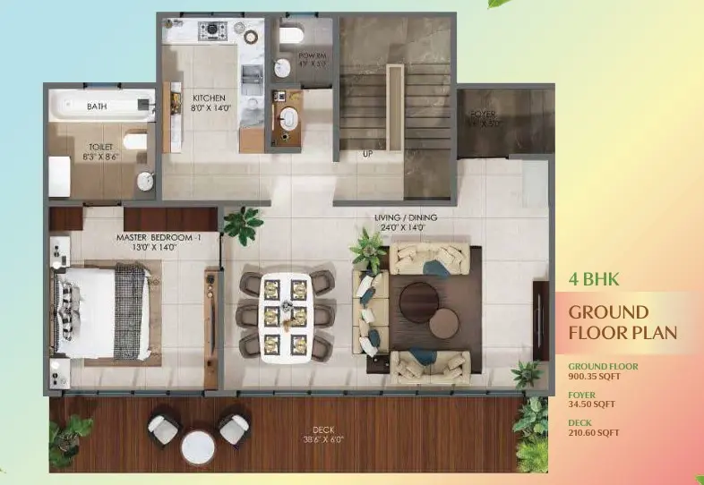 • Ground Floor: Spacious living & dining, master suite, modular kitchen, powder room, and an open deck.