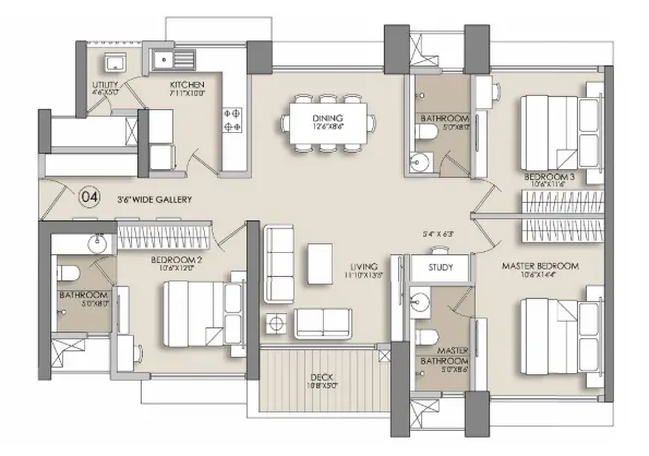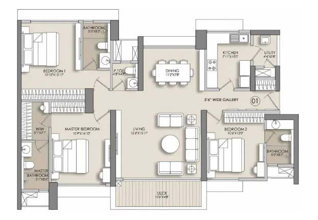 Interior finishes reflect Narang Realty’s uncompromising standards — imported marble flooring in all living areas, designer kitchens with granite platforms, aluminium sliding windows with mosquito mesh provision, video door phone with intercom, gypsum-finished walls with low VOC paints, vastu-compliant layouts, and up to 5-foot-wide private decks with tiled floors and glass railing.