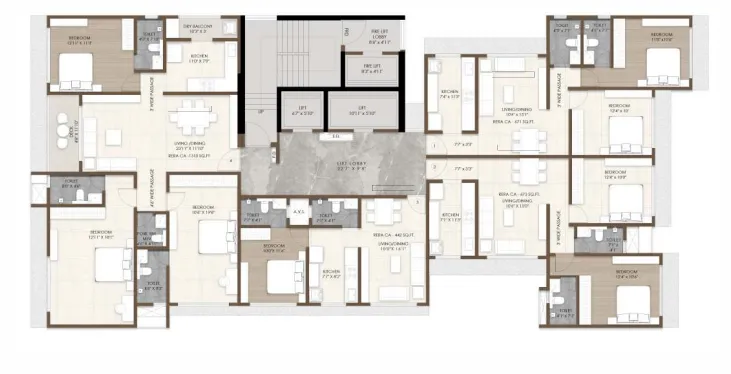 1 BHK residences offer 442 sq. ft. RERA carpet area starting from ₹2.21 Crore — compact yet elegantly appointed. 2 BHK apartments span 671 sq. ft. from ₹3.35 Crore — spacious, vastu-compliant layouts ideal for modern families. The 3 BHK residences are the crown of the collection at 1,310 sq. ft. from ₹6.55 Crore — generously proportioned with full-sized bedrooms, wide passages, and large living and dining areas.