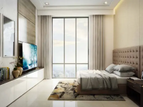 Each apartment is designed with minimal circulation loss, spacious living rooms, generously sized bedrooms, and large windows that frame city, mangrove, and national park views. Premium internal specifications include marble flooring in living areas, vitrified tiles in bedrooms and kitchens, branded sanitary fittings, polished granite kitchen platforms, and powder-coated aluminium windows.