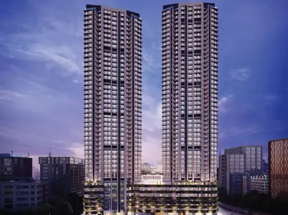 The project showcases a landmark tower with premium entrance lobby, curated amenities, and covered parking designed for modern lifestyles.
