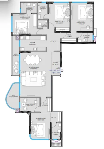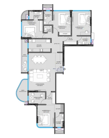 At the top end of the residential offerings are the 4 BHK residences, designed for expansive luxury living. These homes feature large living rooms, multiple bedrooms with attached bathrooms, spacious kitchens, and private decks that provide panoramic city views.